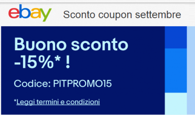 Pochi giorni per acquistare su ebay con un codice sconto del 15% utilizzabile su un acquisto di almeno 10 euro.