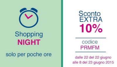 Puoi usare il tuo codice sconto Farman da questa sera, 22 giugno 2015, alle ore 22, fino a domani 23 giugno 2015, alle 8 di mattina: il coupon è riservato esclusivamente allo shopping night di questa notte.