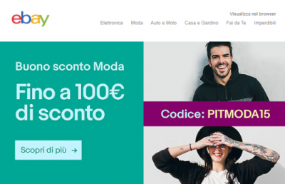 Si tratta di un codice sconto del 15% utilizzabile entro il 7 marzo 2018 su un qualsiasi acquisto ebay moda (ma non solo, come vedremo tra poco). Per chi fosse nuovo dell'argomento codici sconto eBay, ricordiamo che i coupon per questa piattaforma sono quasi sempre legati a Paypal. Anche questa volta, per riscuotere il tuo sconto fino a 100 euro, è necessario scegliere Paypal o carta di credito come metodo di pagamento. Scopri anche tutti i codici sconto Amazon al momento attivi!