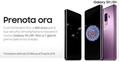 Per chi è sempre in prima fila nell'acquisto dell'ultimo top di gamma e per tutti gli appassionati della tecnologia Android Samsung, segnaliamo un'interessantissima offerta valida solo per la prenotazione del samsung Galaxy S9 e S9 Plus che ti rimborsa fino a 450 euro. Noi l'abbiamo trovata su Amazon, Unieuro, ePrice, ma con ogni probabilità l'offerta sarà valida anche in molte altre catene e sulla maggior parte degli e-commerce di tecnologia.