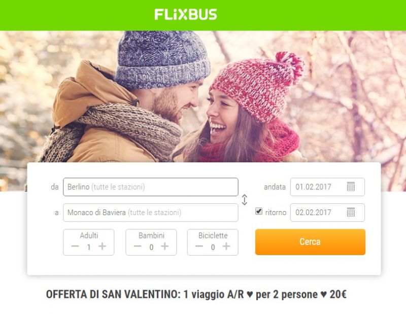 Come recita questa offerta Flixbus, non è importante che tu non creda al potere di San Valentino: anche se pensi che si tratti solo di una festa del consumismo, non c'è mai una scusa valida per non viaggiare! Per questo Flixbus ti propone un Prezzo mini per due persone verso centinaia di destinazioni italiane ed europee. I prezzi indicati sono per due persone, andata e ritorno.