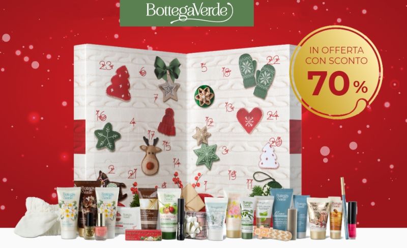 Bottega Verde - il nuovo calendario dell'Avvento di Bottega Verde presenta una selezione di prodotti di un valore di 188,16 euro, proposto però al prezzo speciale di 49,90 euro.
