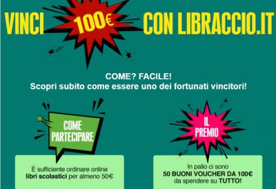Devi acquistare libri e testi per il prossimo anno scolastico? Fallo su Libraccio e prova a vincere uno dei 50 voucher da 100 euro ciascuno in palio! Il concorso Libraccio è valido dal 26 giugno fino al 20 agosto 2017: per partecipare devi solo effettuare un acquisto online di almeno 50 euro di LIBRI SCOLASTICI. Con il tuo acquisto parteciperai automaticamente all'estrazione che si terrà il 28 agosto 2017: in palio ci sono ben 50 buoni sconto, ciascuno del valore di 100 euro. Ecco la pagina della promozione.