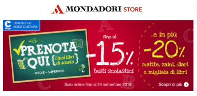 Per il buono sconto del 20% utilizzabile su zaini e articoli di cartoleria invece, l'acqisto dei testi scolastici va effettuato entro il 15 settembre, e viene inviato direttamente entro 6 ore dall'ordine. Sarà immediatamente spendibile su un nuovo acquisto, senza necessità di spesa minima, sulle categorie materiale scolastico e articoli di cartoleria. Il coupon del 20% sul materiale scolastico Mondadori Store è spendibile entro il 24 settembre 2018.