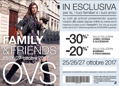 Dopo diverso tempo dall'ultima promozione OVS di questo tipo, ecco finalmente disponibile online un nuovo Buono Sconto Family & Friends per uno sconto del 30% sul tuo acquisto!