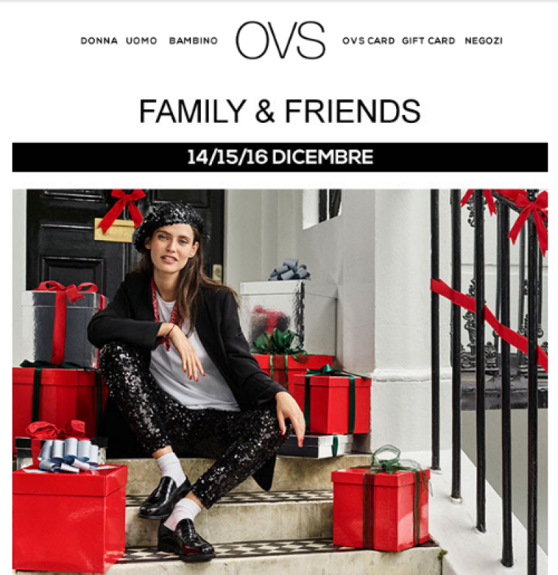 Come per le precedenti edizioni, anche questa volta l'offerta Family & Friends OVS dura solo 72 ore. Tre giorni ti tempo per risparmiare su tutti i tuoi acquisti. Con il Buono Family & Friends potrai risparmiare il 30% su tutti gli articoli delle Collezioni Uomo Donna e Accessori, e il 20% su tutti i capi della Collezione Bambini e sugli articoli del reparto profumeria.