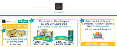 Ecco tutti i dettagli della promozione Pampers: entro la data di scadenza della promozione (domenica 12 novembre) acquista su Mukako pannolini Pampers per almeno 100 euro. Dopo aver effettuato l'acquisto, vai sul sito www.pampers.it ed effettua il login al club Pampers. A questo punto prova a partecipare a uno dei due concorsi attivi in questo momento (o a entrambi): Tablet mio Tab e Lampada. Scopri subito se hai vinto uno dei premi in palio (uno dei 10 Tablet oppure una selle 1000 lampade Pampers) e ricevi i tuoi 5 codici in omaggio per la raccolta punti.