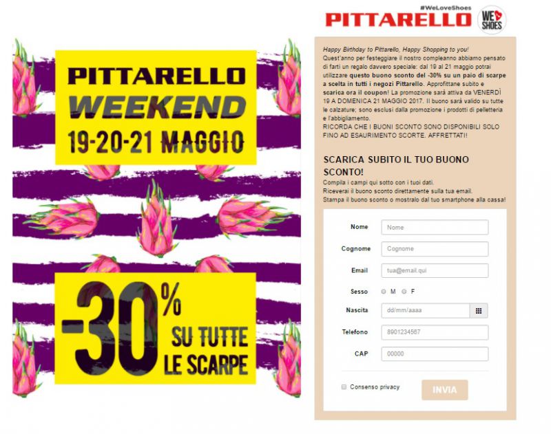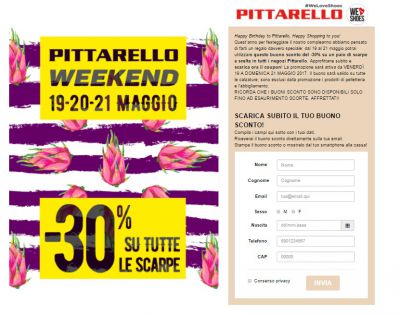 Come al solito, per scaricare il coupon Pittarello clicca qui e procedi alla compilazione del form con i tuoi dati, indica un indirizzo email e attendi la conferma di Pittarello e il link per scaricare il tuo coupon. Se non sei nuovo/a a queste promozioni Pittarello, dovresti già trovare l'invito a scaricare il tuo buono sconto nella tua casella di posta. Il Coupon Pittarello è valido per uno sconto su un paio di scarpe a scelta ed è utilizzabile su tutto l'assortimento, uomo e donna e bambino. Restano invece esclusi dalla promozione gli articoli di pelletteria e i capi d'abbigliamento. Potrai utilizzarlo per tutto il Weekend Pittarello, nelle giornate del 19-20-21 maggio 2017. Come al solito, per i coupon Pittarello la stampa è superflua. Per ottenere lo sconto del 30% sul paio di scarpe che preferisci, ti basterà mostrare il buono sconto in cassa, direttamente dal tuo smartphone. Buono Shopping!