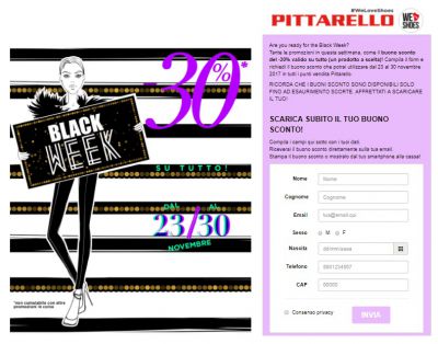 Il buono Sconto del Black Friday 2017 Pittarello ti offre una riduzione del 30% su un articolo a scelta dell'assortimento, in un qualsiasi punto vendita Pittarello d'Italia. Potrai quindi utilizzare il buono sconto per acquistare un paio di scarpe da donna, ballerine, stivaletti o decolletè, o un paio di scarpe da uomo, eleganti o sportive, sneakers o scarpe da bambini, ma anche su abbigliamento, accessori e pelletteria. Per ottenere il buono sconto compila il form con i tuoi dati e attendi la mail di conferma nella tua casella di posta e il link per scaricare direttamente il coupon sul tuo smartphone o sul tuo pc. Ti ricordiamo che per utilizzare il Buono sconto in negozio non sei obbligato a stamparlo: puoi mostrarlo direttamente in cassa dallo schermo del tuo smartphone.