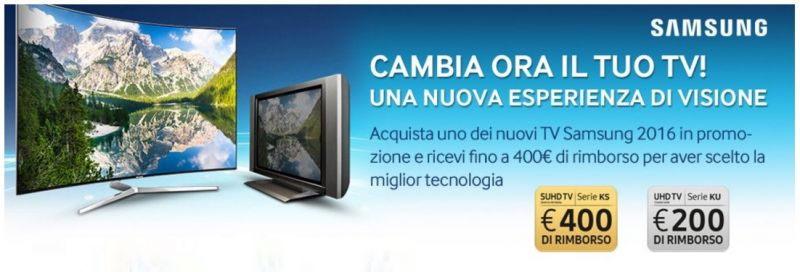 Partecipano a quest'offerta le TV Samsung serie KS, Serie KU e Serie JU: è necessario effettuare l'acquisto entro il 31 settembre 2016, per poter ricevere il rimborso.