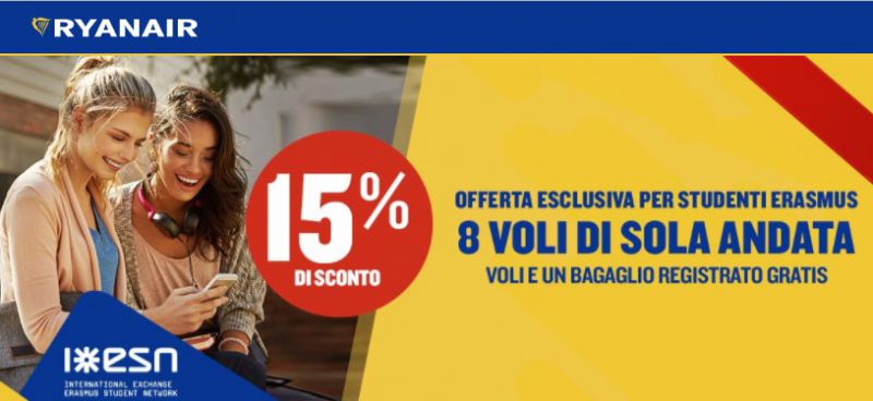 L'offerta Ryanair per risparmiare sui voli dedicata agli studenti Erasmus nasce da una partnership con Erasmo Students Network: offre agli studenti Erasmus grandi risparmi con tariffe scontate, bagagli gratuiti e offerte di viaggio su misura. Scopri direttamente l'Offerta Ryanair alla pagina dedicata. Per tutto il mese di agosto gli studenti potrnno approfittare di uno sconto del 15% sui voli, ma non solo: