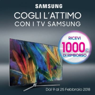Cogli l'attimo con i TV Samsung e ottieni un rimborso fino a 100 euro sul TV acquistato. Se hai già scoperto l'offerta Samsung di San Valentino che ti regala un Galaxy J3, ti conviene dare anche un'occhiata a questa nuova promozione Samsung sui TV che ti offre un rimborso fino a 1000 euro sul tuo acquisto!