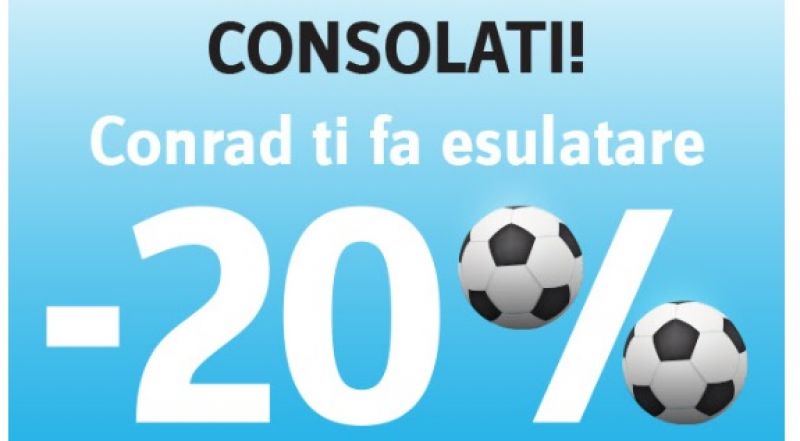 Anche quest'anno, nonostante la mancanza dell'Italia alla competizione, prevediamo interessanti offerte per tutto il periodo estivo, come per esempio questa promozione Conrad che ti offre uno sconto del 20% su un qualasiasi acquisto online. Lo sconto si applica utilizzando questo codice promozionale. L'offerta è valida su tutto l'assortimento, non solo su TV e Home Cinema, ma anche su telefonia e gadget elettronici, computer e articoli per l'ufficio, multimedia e prodotti per il tempo libero, componenti elettronici, gadget e articoli di climatizzazione. Restano esclusi dalla promozione i prodotti che sul sito prsentano l'icona "non scontabile". Il coupon Conrad si attiva su un carrello minimo di 69 euro ed è valido fino al 18 giugno.