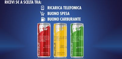 Puoi ricevere il tuo buono carburante con Red bull con un semplice acquisto di almeno due lattine nei nuovi gusti della celebre bevanda energetica nei punti vendita che espongono il materiale promozionale di questa offerta.