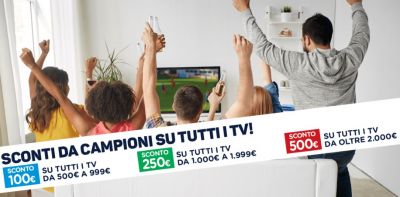 L'offerta è valida fino al 7 giugno e ti offre uno sconto di 100 euro sull'acquisti di TV di costo compreso tra 500 euro e 999€; uno sconto di 250 euro sulle TV di importo compreso tra 1000 euro e 1999 euro e infine un eccezionale sconto di 500 euro sull'acquisto di un TV a partire da 2000 euro di acquisto. Ecco 3 esempi di TV acquistabili a prezzo scontato.