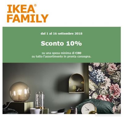 Lo sconto è valido su un acquisto di almeno 80 euro. Il buono IKEA è utilizzabile su tutto l'assortimento in pronta consegna e su tutte le collezioni di mobili, arredamento e accessori Il codice sconto che trovi nella newsletter IKEA è univoco, così come l'QR Code legato alla tua carta fedeltà IKEA. Lo sconto è utilizzabile online o in negozio dall'1 fino al 16 settembre 2018.