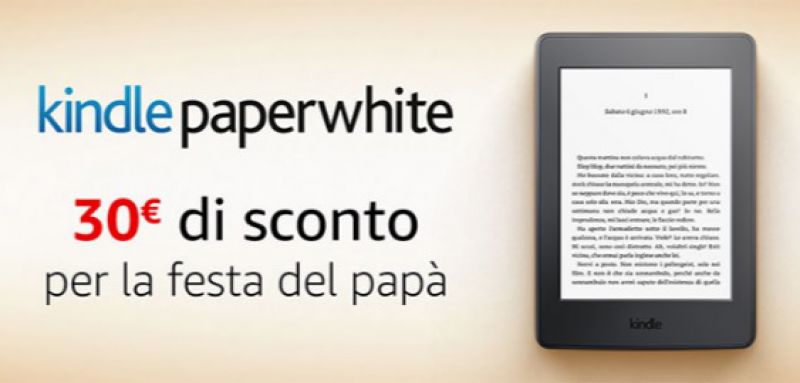 Si tratta dello Sconto di 30€ sui Kindle Paperwhite: l'offerta è valida per un periodo di tempo limitato: lo sconto di 30 euro è applicato a tutti i modelli Kindle Paperwhite in assortimento: E-reader Kindle Paperwhite, schermo da 6" ad alta risoluzione (300 ppi)con luce integrata e Wi-Fi, con o senza offerte speciali: 99,99€ anziché 129,99€; E-reader Kindle Paperwhite 3G, schermo da 6" ad alta risoluzione con luce integrata, 3G gratuito + Wi-Fi, con o senza offerte speciali: prezzo 159,9€ anziché 189,99€. Il Kindle Paperwhite è inoltre disponibile su Amazon sia nel colore nero, sia nel colore bianco, allo stesso prezzo. Lo sconto di 30 euro su tutti i modelli di Kindle Paperwhite è direttamente applicato al prodotto, senza necessità di inserire alcun codice promozionale Amazon nel carrello. Trovi tutti i codici sconto Amazon oggi disponibili alla pagina dedicata. Se vuoi acquistare un Kindle Paperwhite per fare un regalo per la Festa del Papà, ma hai paura che il pacco non arrivi in tempo, ti ricordiamo che con Amazon Prime hai la consegna grarantita in un giorno lavorativo su oltre un milione di prodotti.
