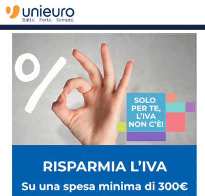 Devi cambiare elettrodomestici, acquistare una nuova TV o fare acquisti di elettronica e tecnologia? Approfitta di questa interessante promozione Unieuro, valida solo questo weekend, per risparmiare il 22% di IVA su tutti i tuoi acquisti di elettronica e tecnologia. La promozione Unieuro si chiama Solo per te l'IVA non c'è, ed è valida online e nei negozi UNIEURO, solo dal 27 al 30 aprile 2018. La promozione prevede uno sconto del 22% dell'Iva su tutti gli acquisti di almeno 300 euro. Attenzione però: è necessario precisare che il 22% di IVA corrisponde in realtà al 18,04% sul prezzo effettivo di vendita dei prodotti del catalogo Unieuro. Per esempio, su una spesa di 300€ precisi (IVA inclusa), lo sconto del 18,04% ti porterà ad un prezzo finale di 245,90€. Trovi questa offerta e tutti i codici sconto Unieuro da utilizzare sul sito o in negozio alla pagina dedicata.