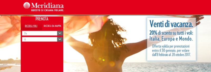 Stiamo parlando dell'offerta Meridiana "venti di Vacanza": la compagnia Meridiana offre uno sconto del 20% su tutti i Voli, ma solo per un periodo di tempo limitato.